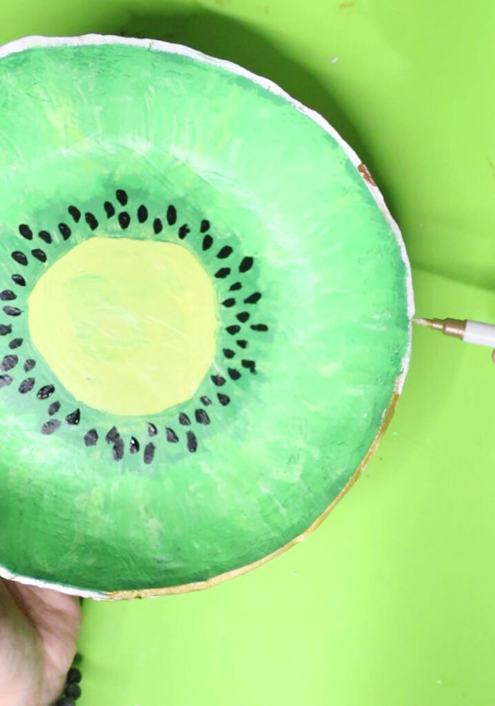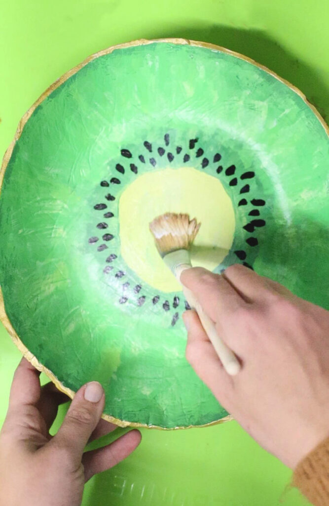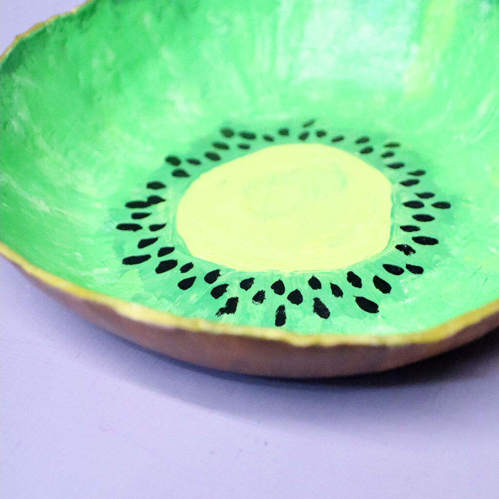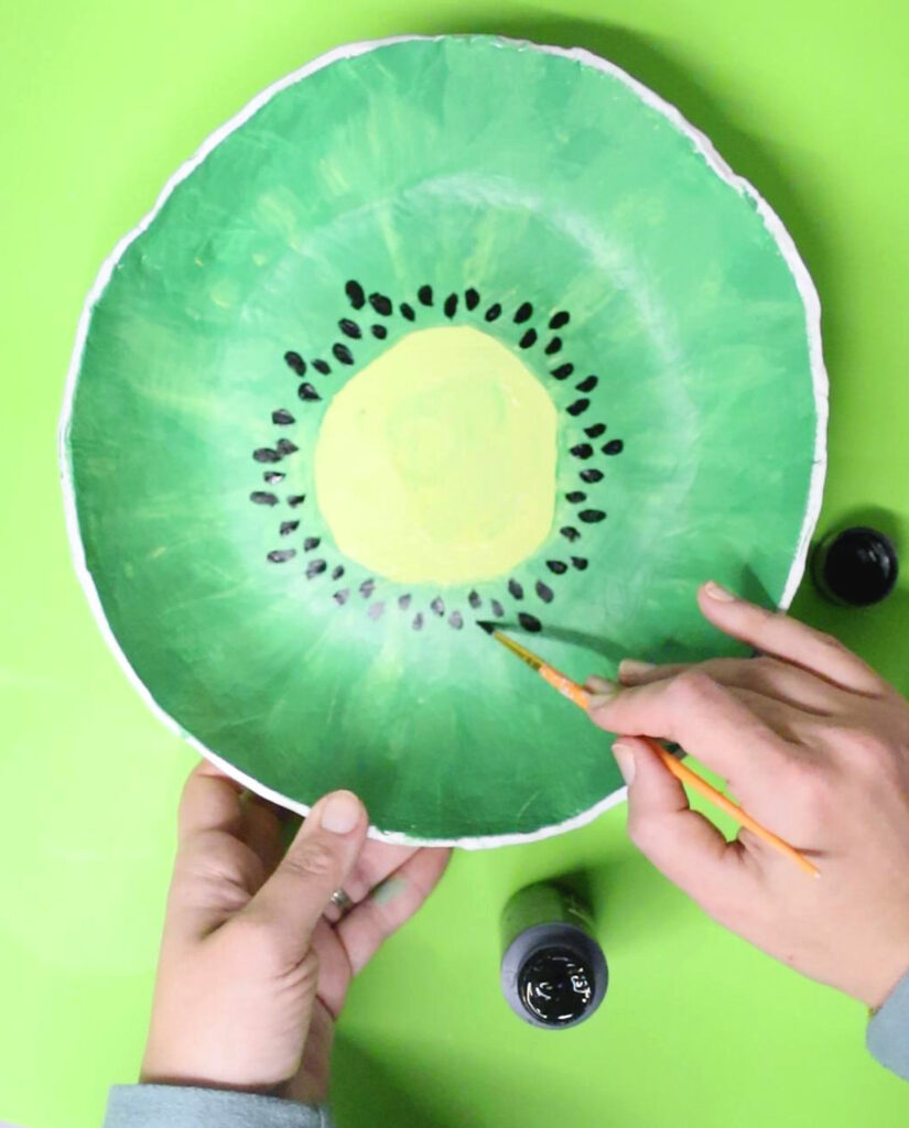 Painting your fruit bowl can be stressful. I recommend not looking too close at your bowl when you are painting it. Take a step back and see how it looks then. I reworked my kiwi bowl a LOT. I share more ideas for how to finish it below, so if you are uncomfortable with making a fruit slice, go ahead and do one of my alternate ideas.