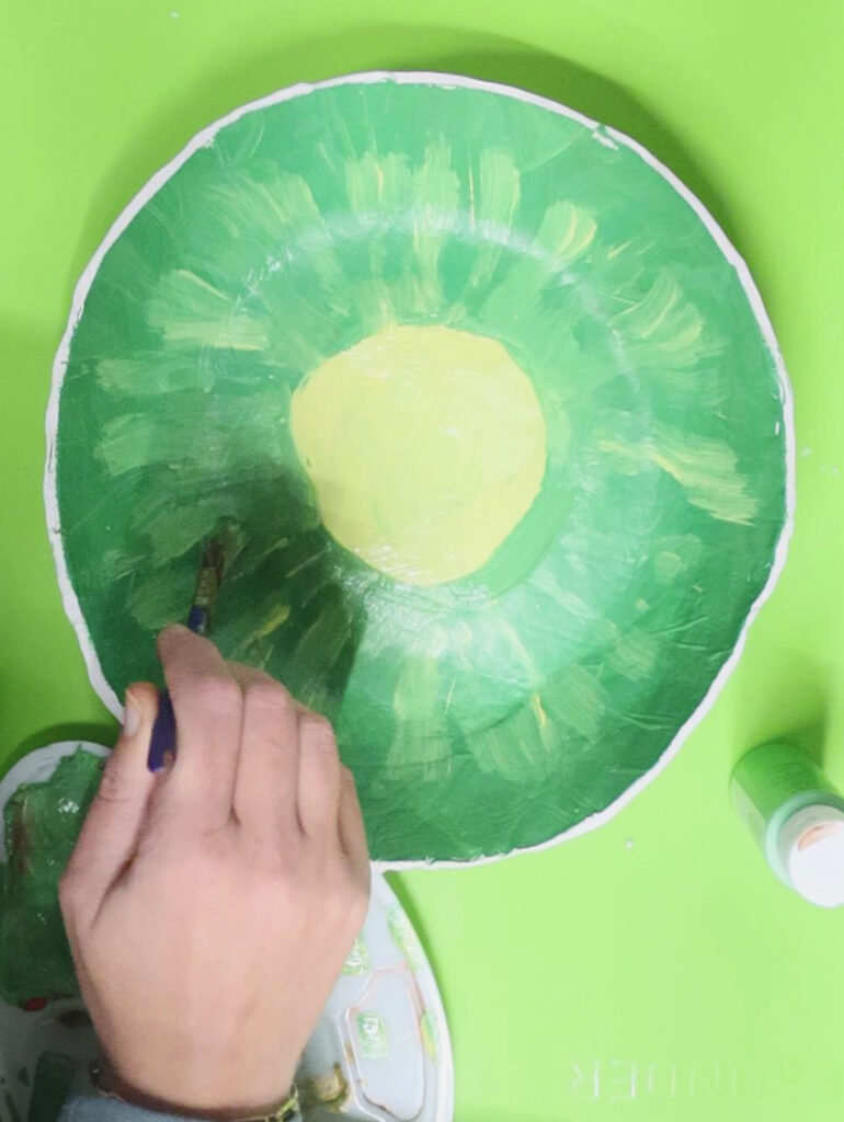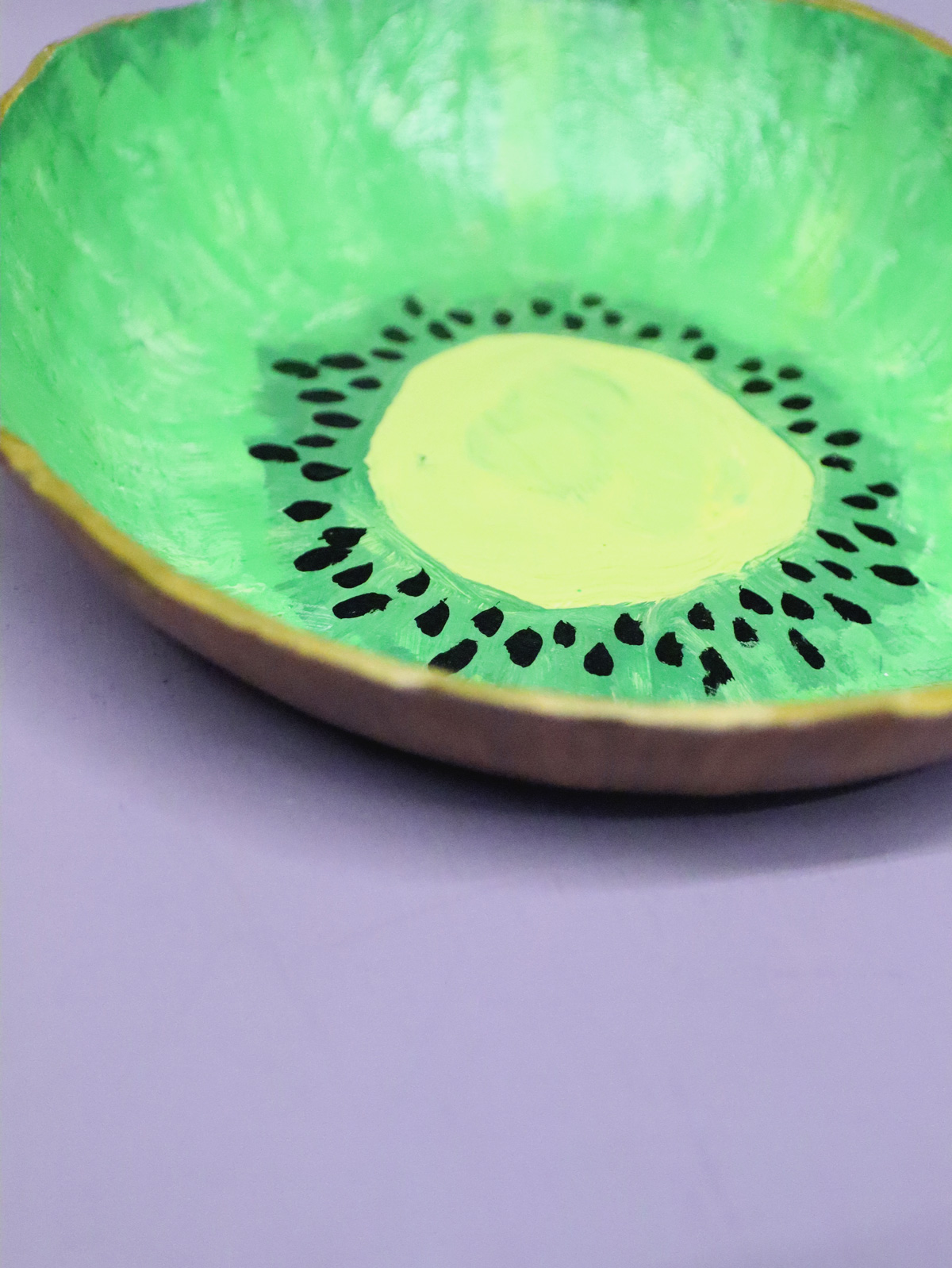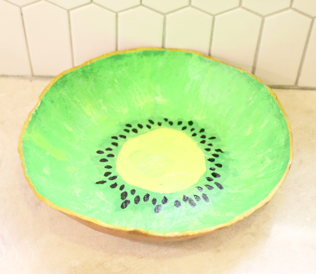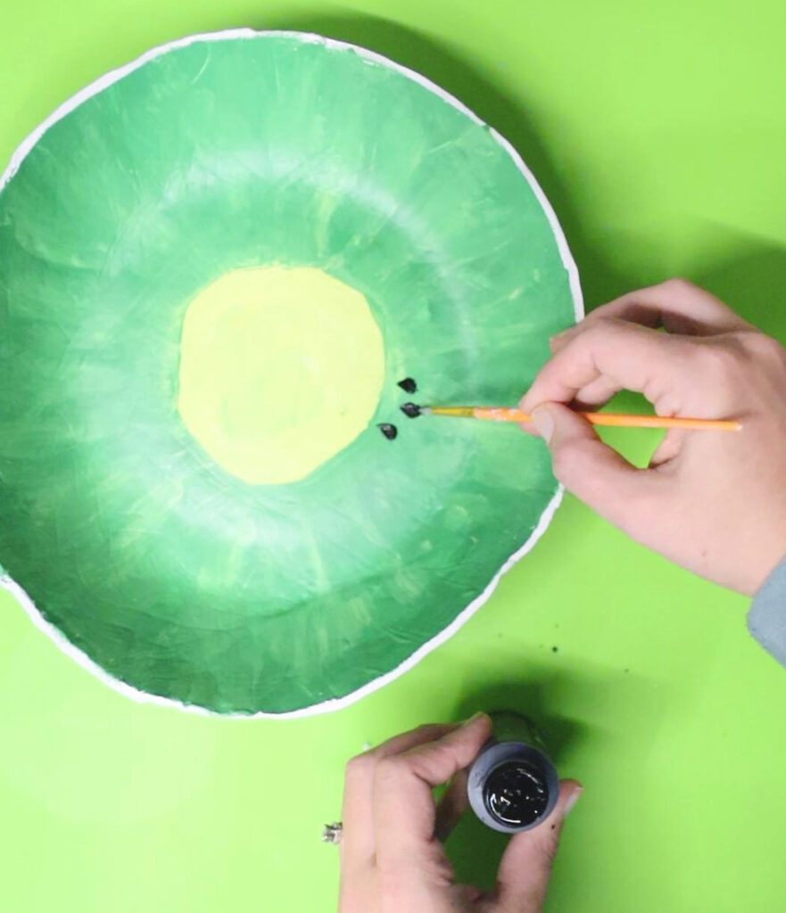 Painting your fruit bowl can be stressful. I recommend not looking too close at your bowl when you are painting it. Take a step back and see how it looks then. I reworked my kiwi bowl a LOT. I share more ideas for how to finish it below, so if you are uncomfortable with making a fruit slice, go ahead and do one of my alternate ideas.