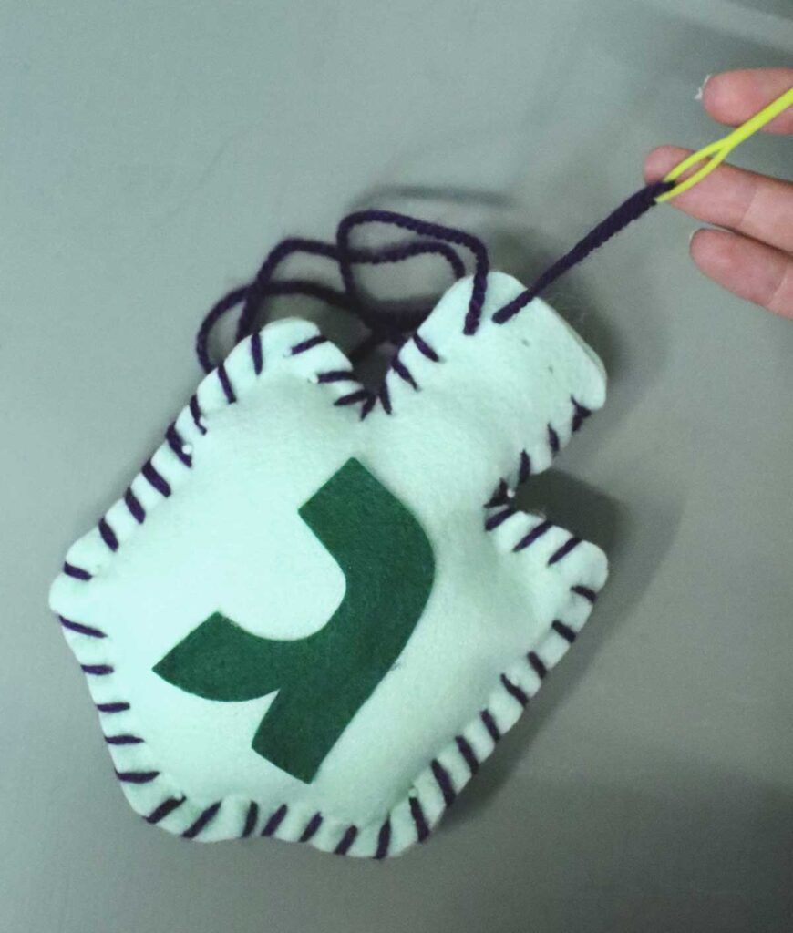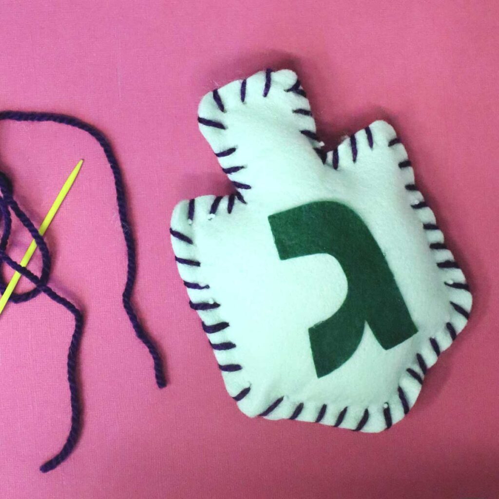 One is a soft felt dreidel plushy that you “sew” using simple lacing stitches that preschoolers can do – and stuff with poly fil.