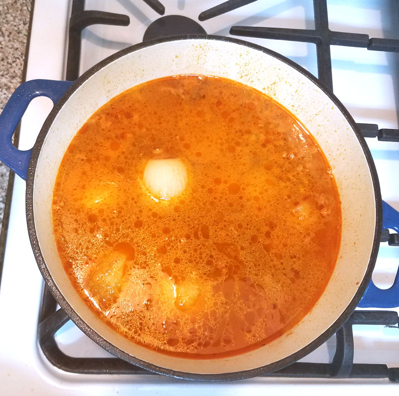 Add ketchup (optional) – about 1/2 cup and honey – about 1/4 cup. The honey helps the top caramelize a bit. If you have a baby less than a year old who eats cholent, you can substitute the honey with duck sauce. Bring to a boil, reduce to a simmer, and cook about half an hour or until your potatoes begin to soften but aren’t falling apart.