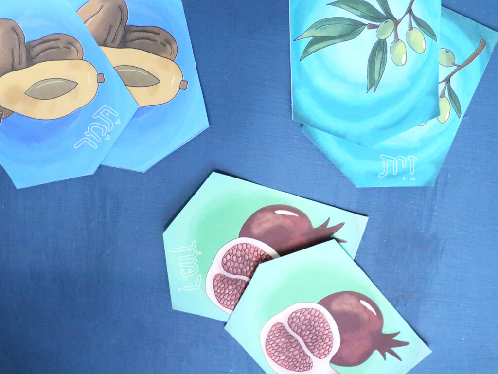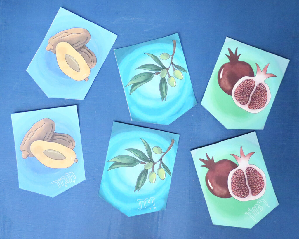 For each version, I’ve made one both with text and without. The text says the Hebrew word for that fruit. The biblical verse for the fruit isn’t always an exact match (for example, dates are referred to as Devash – or honey.) I used the Hebrew word for the fruit (dates are Tamar).