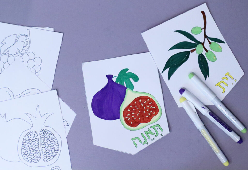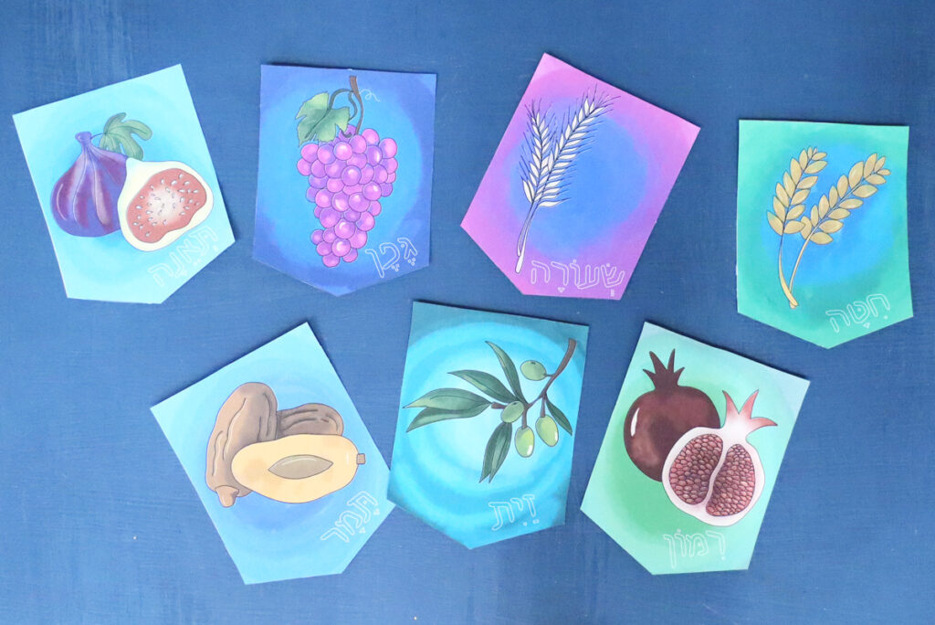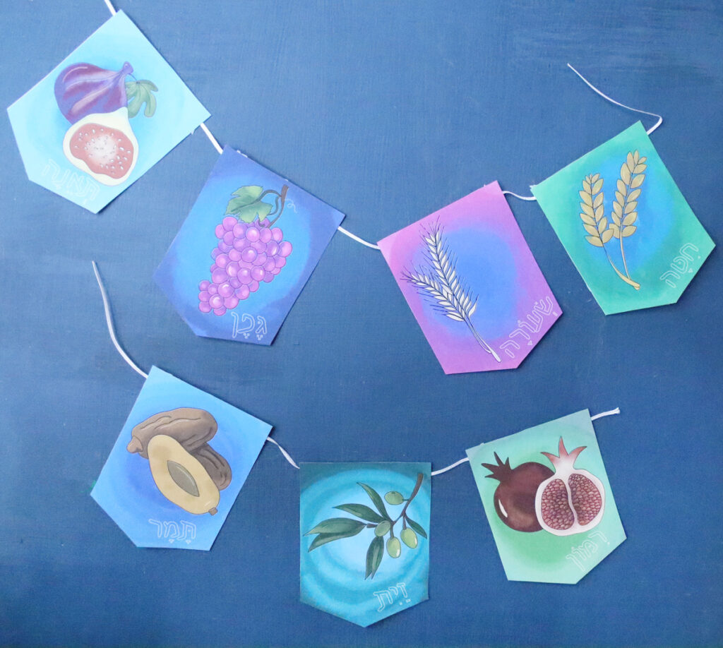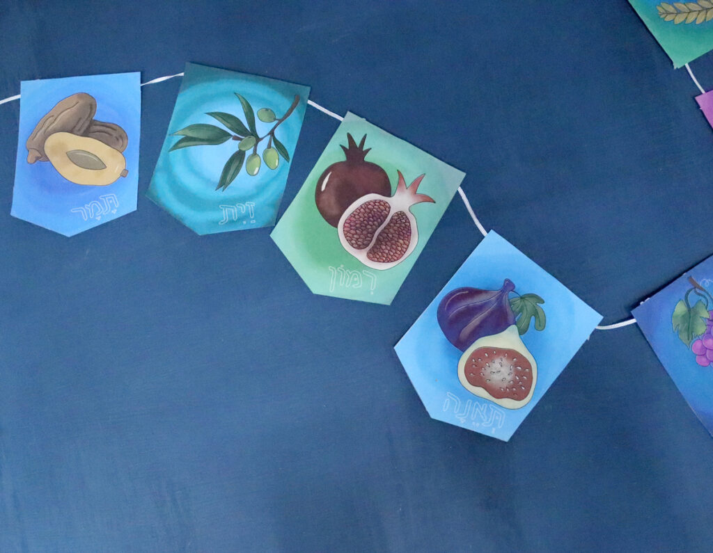 This Shivat Haminim garland printable makes gorgeous home or classroom decor for Tu B’shvat, Yom Ha’atzma’ut (celebrating the special fruit of Israel), or as a Sukkah decoration. It’s easy to assemble and will look gorgeous – whether you’re coloring it yourself or using my colored version.