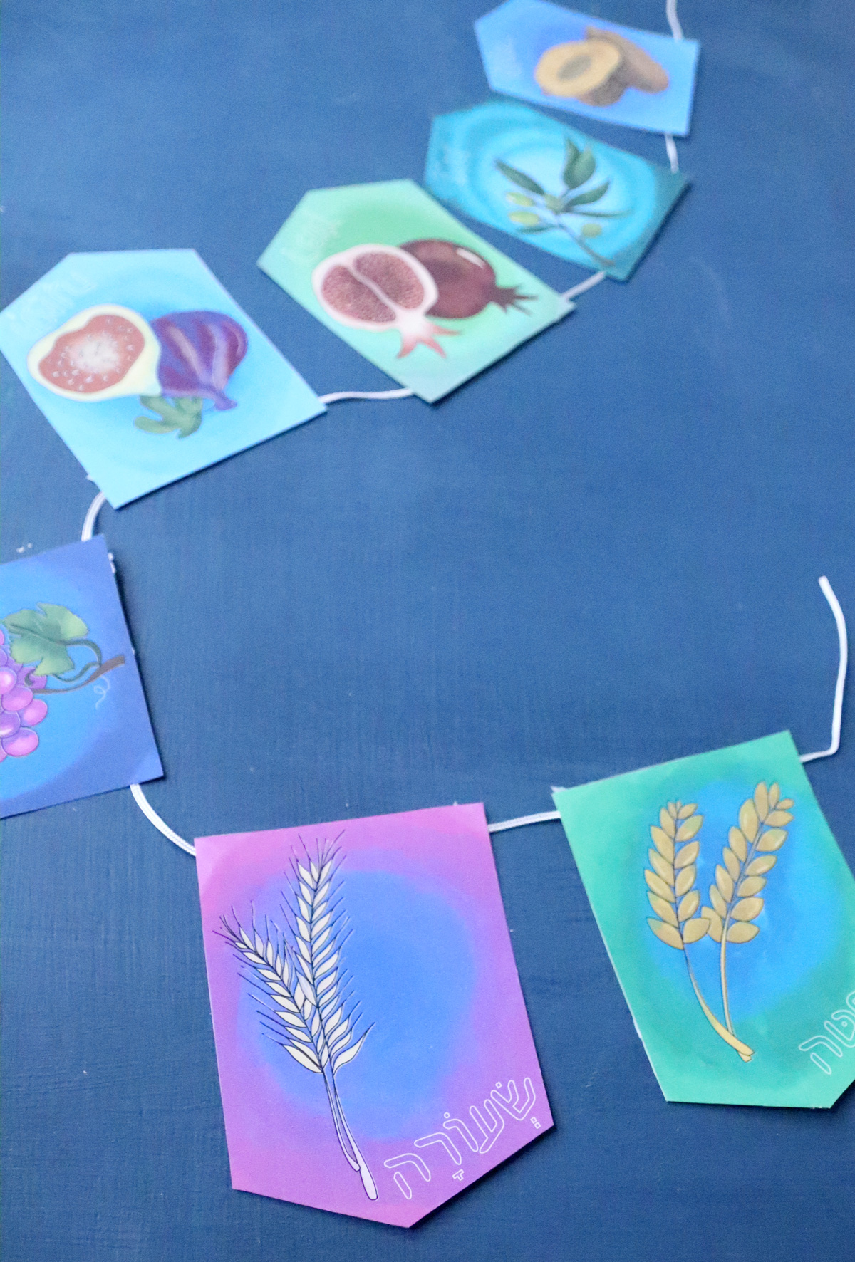 The garland is scaled to full pages so that you can display it large. Since images can be scaled down without losing quality but not up, I wanted to leave you with the maximum quality. I did not include any specific hanging mechanism in the template so that you can choose that as well. Here are some ways you can string this Shivat Haminim garland printable – or not!