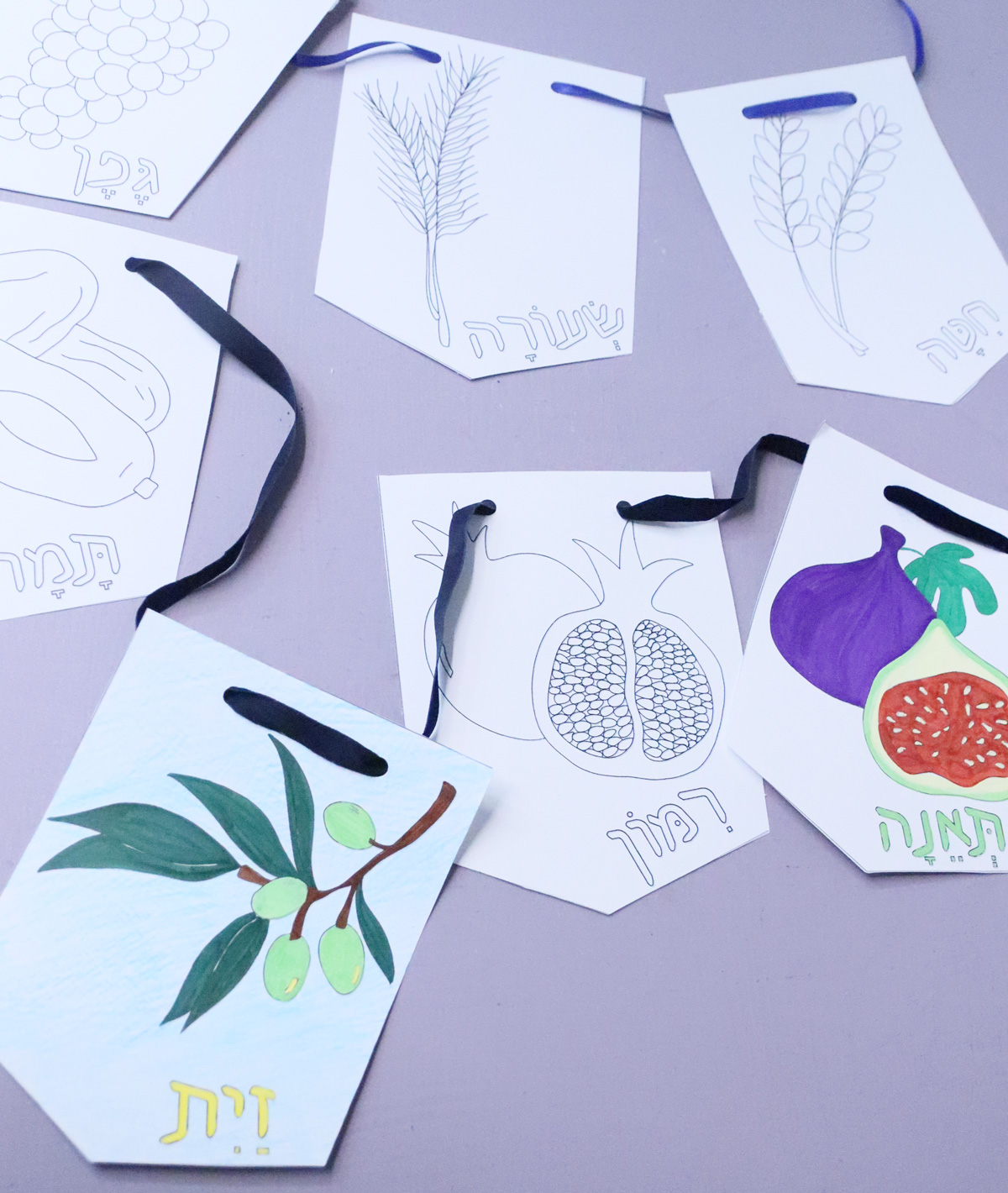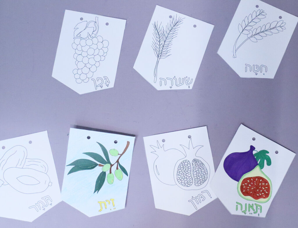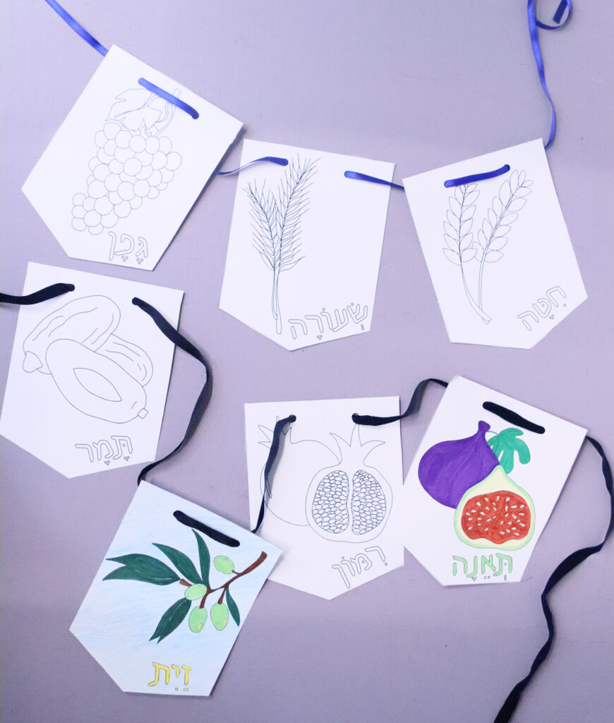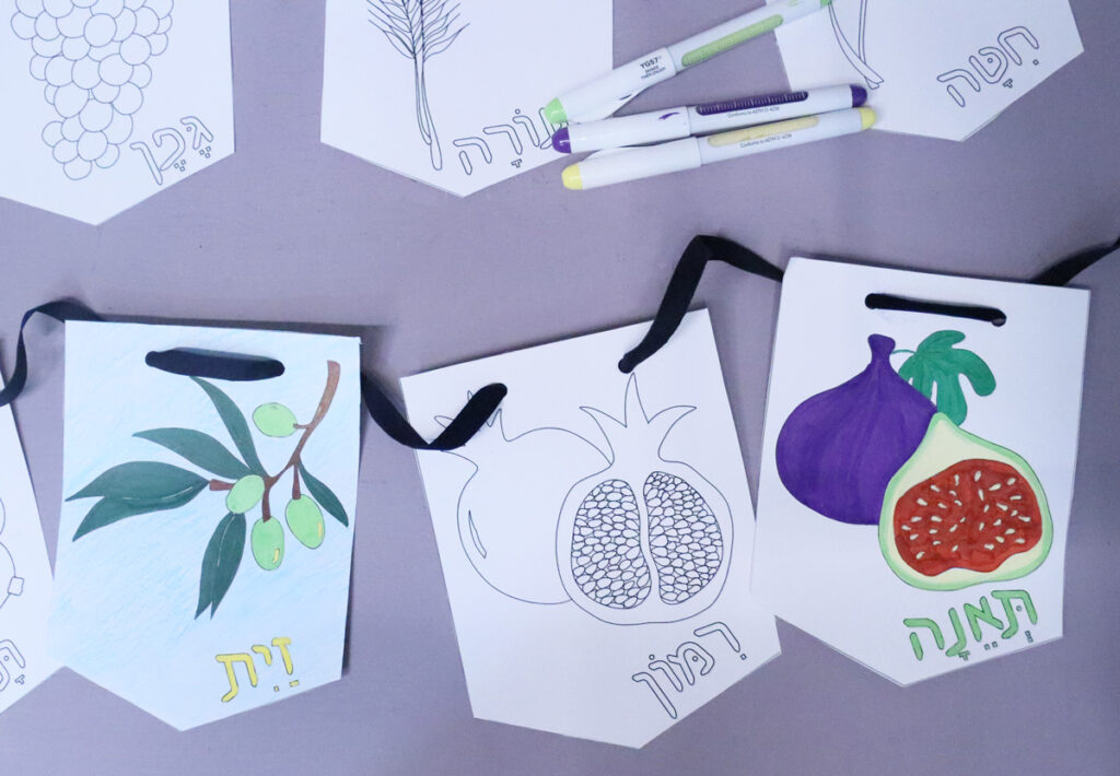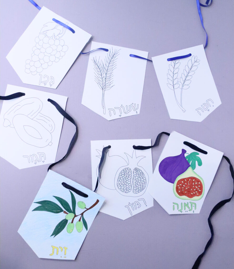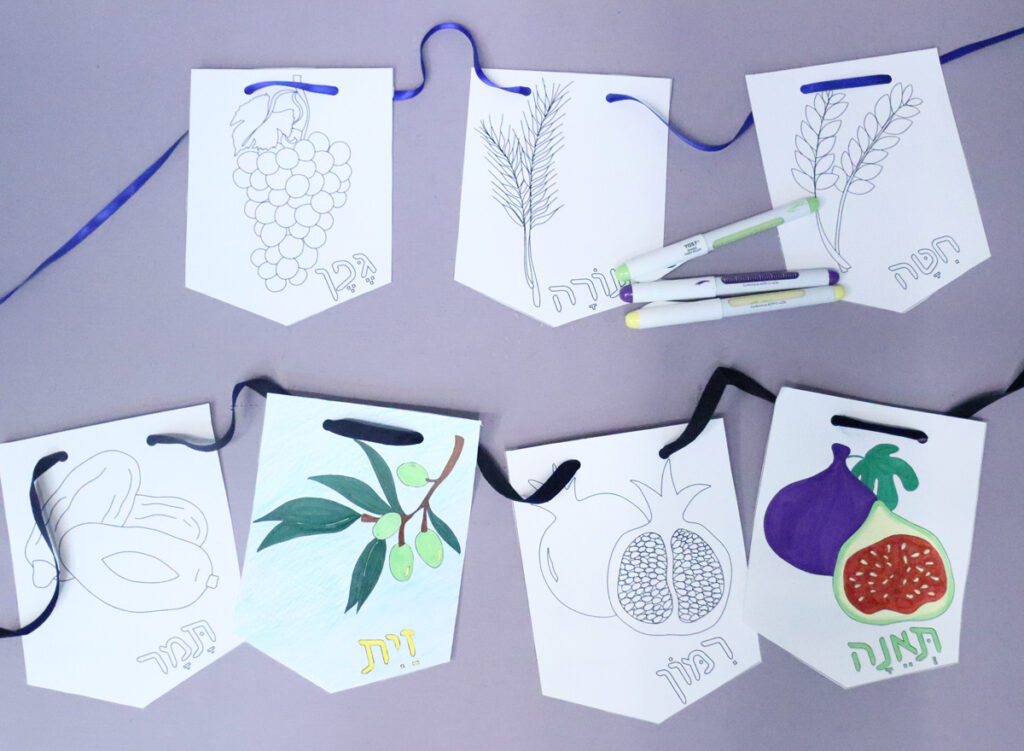 Available as two separate downloads, you can choose from full color Shivat Haminim garland printables or from a color-in version.