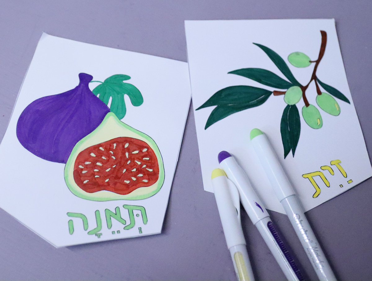 This Shivat Haminim garland printable makes gorgeous home or classroom decor for Tu B’shvat, Yom Ha’atzma’ut (celebrating the special fruit of Israel), or as a Sukkah decoration. It’s easy to assemble and will look gorgeous – whether you’re coloring it yourself or using my colored version.