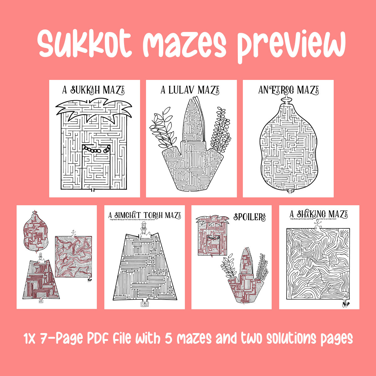 Pages include the Sukkah, Lulav, Etrog, Shaking, and Simchat Torah mazes plus solutions.
